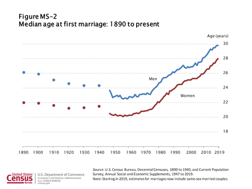 According to US Census data, marriage has been delayed by nearly a decade. This isn't indicative of any one variable, but you can see this anecdotally talking to groups of young professionals.